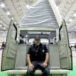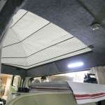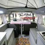 今回展示していた車両は、日本に輸入する前にイギリスである程度仕上げてきたそう。今はまだフルベッドは入れていませんが、設置すればポップアップルーフ部分に2名、ダイネット部分に2名寝ることができます。