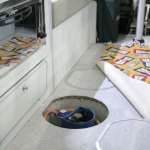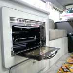 キッチンは給排水完備で、ガスオーブンも設置済み。ガスボンベは床下に格納されます。ただ、日本では保安上の問題からキャンピングカーにLPガスを充填してくれる会社が少ないので、この設備をどう維持していくかは事前によく検討しておきましょう。