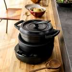 鉄鋳物ほうろう鍋とヒーターで構成される電気鍋。食材を入れてボタンを押すだけで、自動で火力を調整し、ほったらかしでの無水調理ができる。直径20cmで、保温モードを搭載。単体でもガスコンロやIHヒーターでも使える。