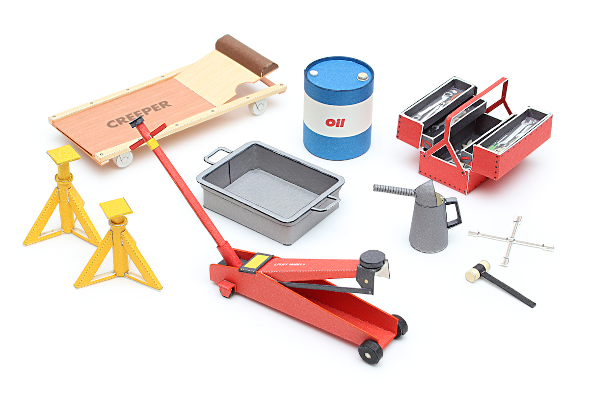 キット内容は、ガレージツールとしてお馴染みの工具箱やオイルパンをはじめ、オイル缶、油圧ジャッキ、クリーパー、リジットラック(2個)。そう、自動車には欠かせないツールばかりです。完成したら、アップリフトが発売する12分の1スケールの自動車ペーパークラフトと合わせて飾れます。