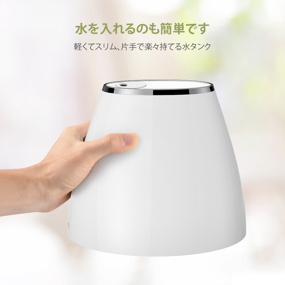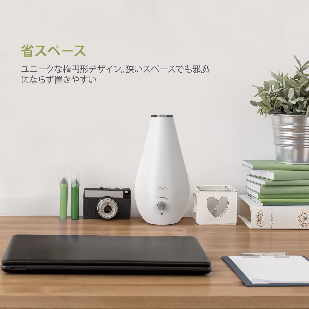 しかし、問題は置き場所。狭い部屋だったり書斎やオフィスなどでは、大きな加湿器は邪魔になります。そんなときに重宝するのが、デスクの上などの限られたスペースに置けるコンパクトデザインの「VAVA 超音波加湿器 VA-AH009」。しずくのような流線形のデザインもスタイリッシュで、景観を損なうこともありません。