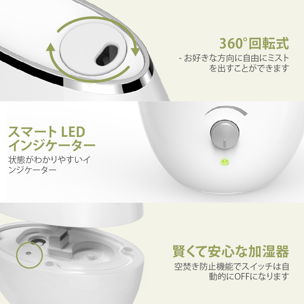 状態がひと目でわかるスマートLEDインジケーター付きで、空焚きを防止するため水がなくなったら自動的にOFFになる機能も搭載。さらに、静音設計なので、寝室でも使えます。一台あれば、家中どこでも潤してくれそうですね。3399円というお手頃価格も嬉しいですね。