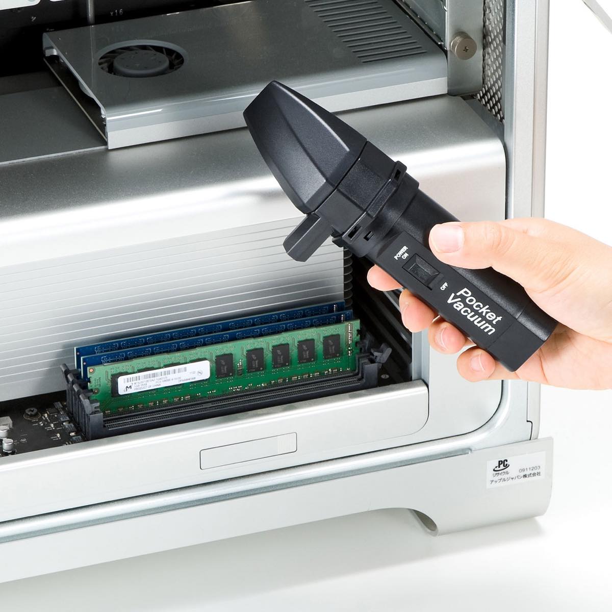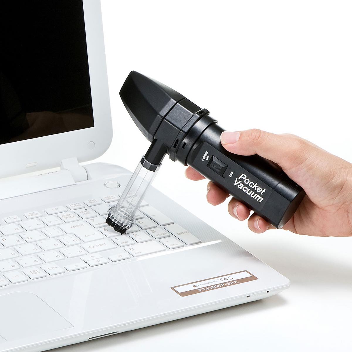 机上の消しゴムのカスはクリーナーで吸引し、PCのキーボードの隙間に入った細かいゴミはダスターで吹き出させられます。キーボードの隙間で空気を当てても出てこない困ったゴミは、付属の“すき間ノズル”を使って吸い出せます。