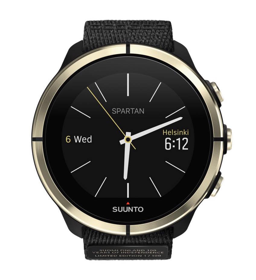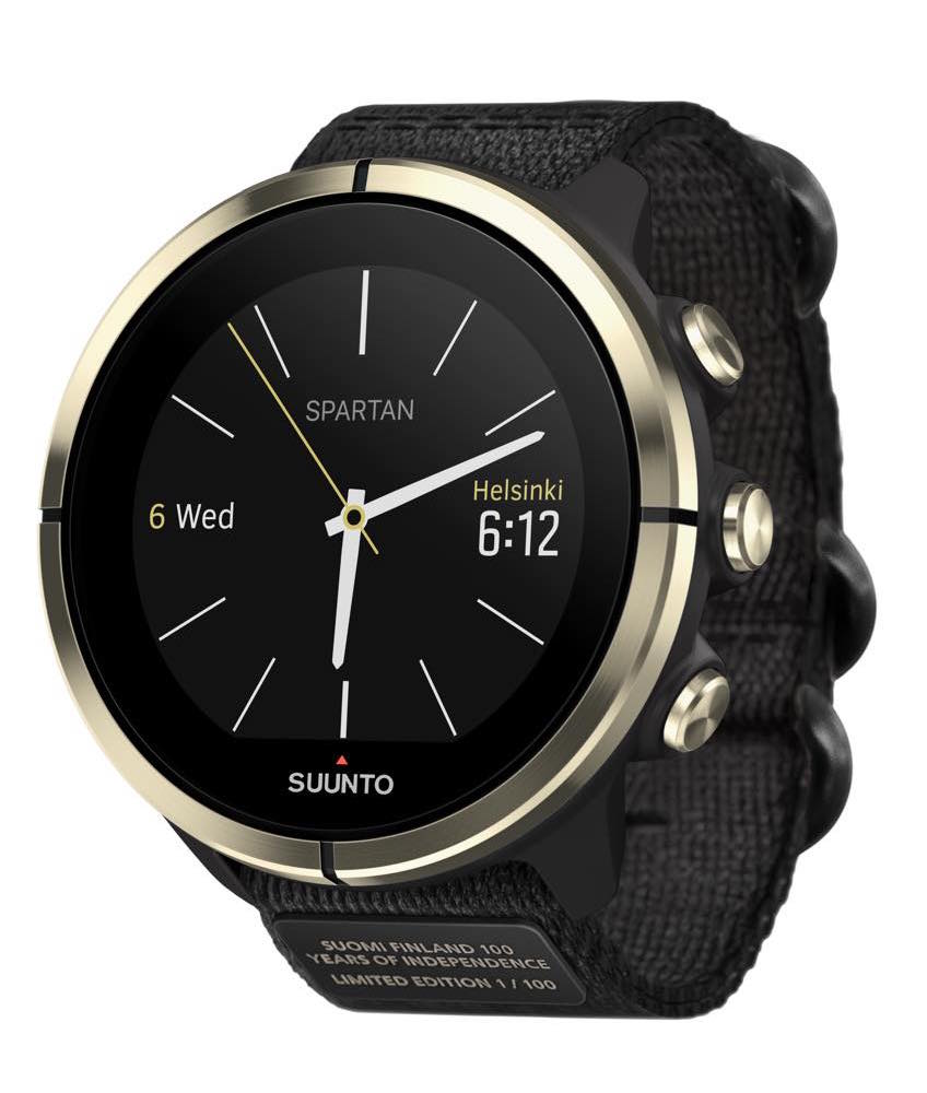「SUUNTO Spartan SUOMI 100 Limited Edition」は、その名があらわしている通り、ブランド創業地であるフィンランドの独立100周年を記念して作成された限定モデルのリストウォッチです。ゴールドメッキを施したグレード5チタン製ベゼル、ステンレス・スティール製ボタン、サファイアクリスタルガラス、そしてシリアルナンバーが刻印された高級テキスタイルストラップが採用されています。