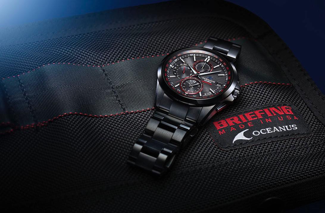 カシオ・OCEANUS(オシアナス)といえば、誰もがイメージするのが海を思わせる深いブルー。そのイメージをいい意味で覆す新コレクションがこの夏登場。ラゲッジブランド・BRIEFING(ブリーフィング)とのコラボレーションにより生まれた「OCW-T2610BR-1AJR」(14万8000円/税別)は、 “黒×赤” という、いままでにない大胆な配色に驚かされます。