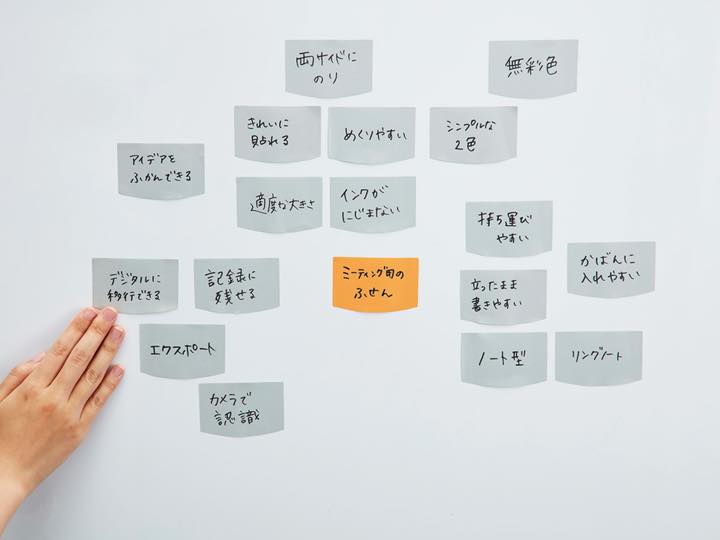「くみかえノート」は、共創型戦略デザインファームbiotopeの佐宗邦威氏と東海大学の富田誠教授が「デザイン思考」に基づいて共同開発した、アイデア出しミーティングやアイデア共有の現場での使用に特化したスマート文具です。