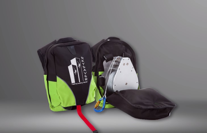 そこに注目したのが、SKYSAVERというアメリカの会社で、投入した商品も「SkySaver」と呼ばれています。これはリュックサックに降下用ウィンチを内蔵したもので、建物の窓から脱出できる非常用デバイスです。