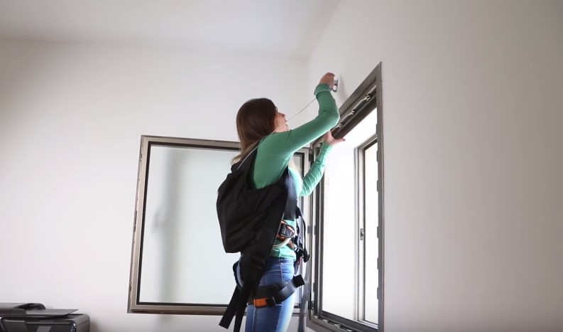 火災発生時で非常階段が使えない際「SkySaver」を背負い、ハーネスを身体に装着します。降下用ウィンチについたフックを窓枠近辺にあらかじめ設けたステー、もしくは室内の動かないモノに引っ掛けます。