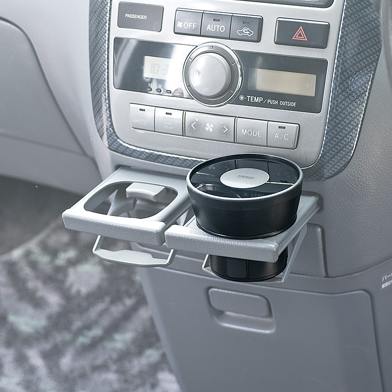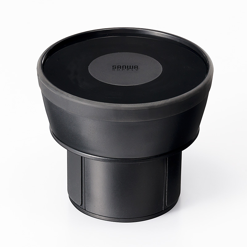 ホルダー上部を回転させると下部の3カ所の突起が広がり、ドリンクホルダーに合わせて68mmから96mmまでサイズ調節が可能。突起部の表面はラバー素材、底部はスエード素材で、ドリンクホルダーへの傷が付きにくい仕様だ。