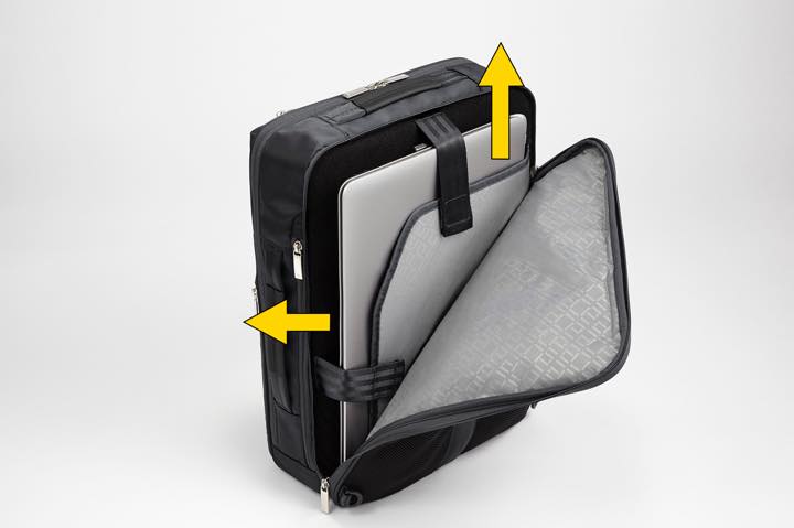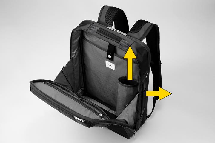 満員電車の中などで前に抱えやすいうえ、さらに収納可能なリュックハーネスを片方の肩にかけて横向きでも使いやすいデザイン。それに合わせて、オーガナイザーポケットやボトルホルダー、PC収納部などは縦に持っても横に持ってもアクセスしやすい構造になっているのが特徴です。