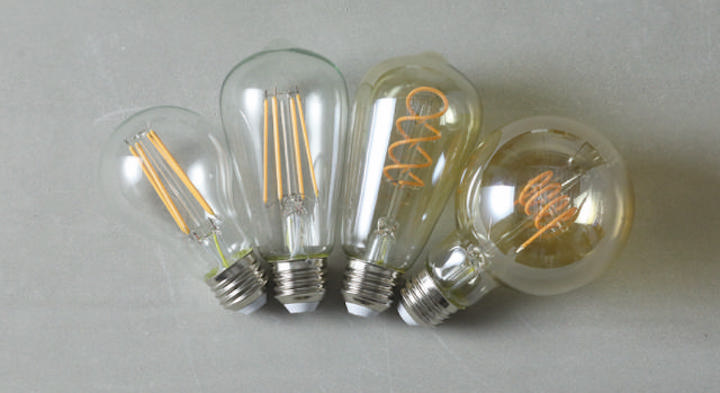 「エジソンバルブLEDスマート」は口金サイズE26で、丸いフォルムのノーマルタイプとロングタイプの2タイプ。さらに、まっすぐの線のフィラメントを搭載したクリアガラスと、スパイラルのフィラメントを搭載したゴールドガラスの2タイプを用意しています。