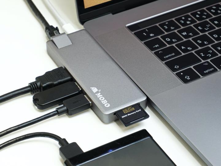カードスロットはSDカードとMicroSDカードの同時使用に対応したデュアルスロットを採用し、MicroSDカード口はカードの取り外しが楽なラッチ付きとなっています。本体サイズは110×44×厚さ17mmで、重さは約95g。本体に備わっているゴム脚がデスク面にしっかり接地し、ガタつき感は皆無。カラーはMacBook Air/Proと同系色のスペースグレー1色のみです。