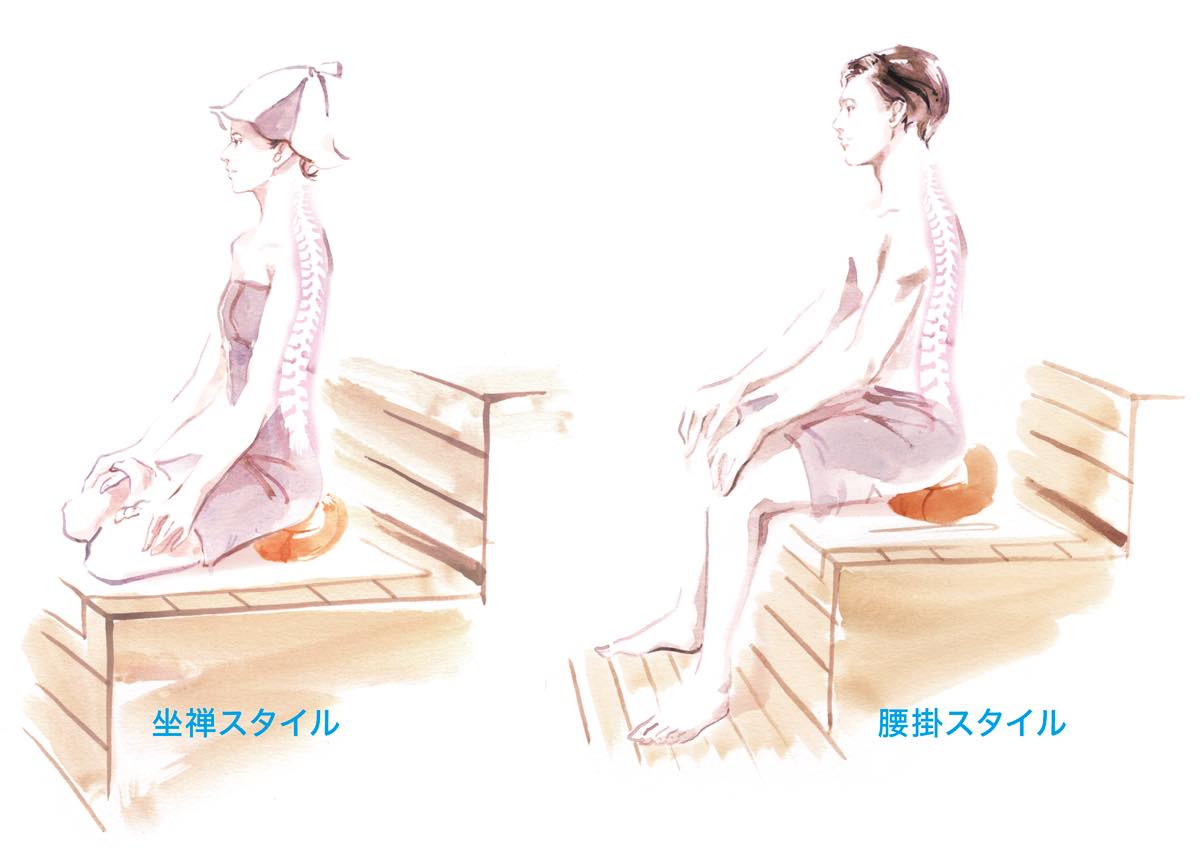 軽く腰をかけることで、骨盤が立って自然に背骨が美しいS字カーブを描きます。坐禅スタイルでは足を組んでストレッチさせることでより快適にサウナを楽しめます。人が多い場合は腰掛けスタイルでもかまいませんし、足を伸ばしても大丈夫です。