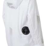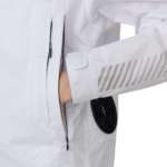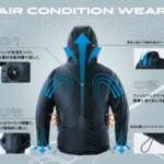 腹部に搭載した2基の小型ファンが特徴で、このファンが外の空気をウエアの内部に取り込み、その流動する涼しい空気によって汗を蒸発させるとともに、内部の湿った温かい空気を首元や袖口から効率よく逃がすという仕組みです。収納可能なフードをかぶれば、頭部まで涼しい気流が行きわたります。