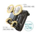 計12個の指圧突起がついたもみ玉が繰り出す、もみとたたきを組み合わせた「もみ・たたき」と伸ばすようにマッサージする「ローラー」の2種類は、お好みで選択可能。付属の調節パッドでマッサージの強さを自由に調節できます。