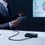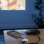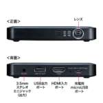 コンパクトでも映像はハッキリ映し出すことができ、HDMI端子を使ってスマホ(iPhoneもOK)やタブレット、PCなどの映像を、0.5~3mの投射距離で10~60インチのスクリーンに投影。映像の解像度は640×360、明るさは30ルーメンとなっており、資料などの小さな文字もしっかり読めます。