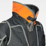 高襟のシャツは、フロントと両袖に複数のポケットを装備。ベストの襟は取り外し可能で、面テープを使って立てると襟裏の鮮やかなオレンジの裏地が現れます。パラシュート部隊をモチーフとしたバック部分のループ型Aラインテープが印象的です。