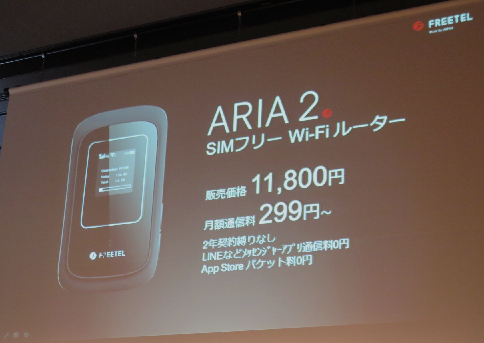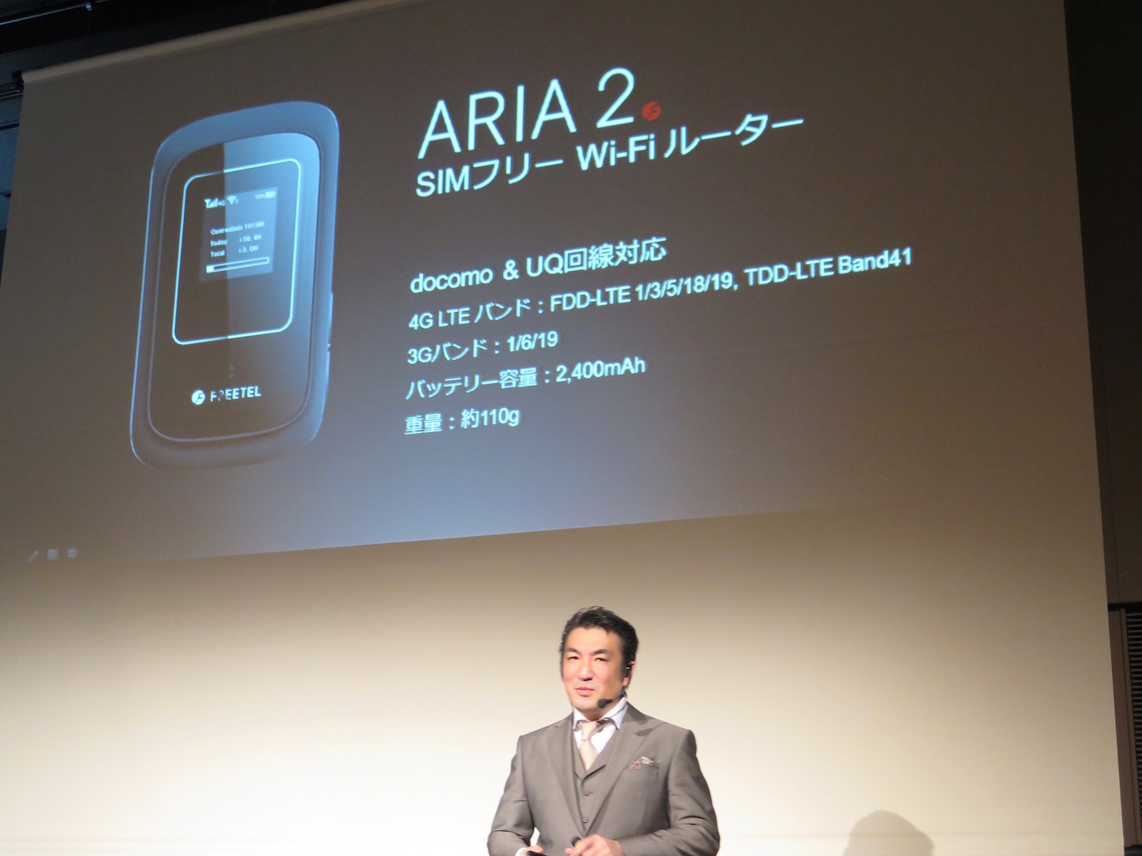 2年ぶりにSIMフリーのモバイルWi-Fiルーターも発表されました。「ARIA 2」は、NTTドコモ回線だけでなく、UQ回線(Band41)も利用できることがセールスポイント。ただし、ドコモ回線を利用するFREETEL SIMではUQ回線には接続できません。発表会後の囲み取材では、記者から「UQのSIMはUQ端末でしか使えないのではないか?」という質問があり、それについては「確認します」という回答でした。UQ回線に対応したメリットについては、今後の発表を待つ必要がありそうです。