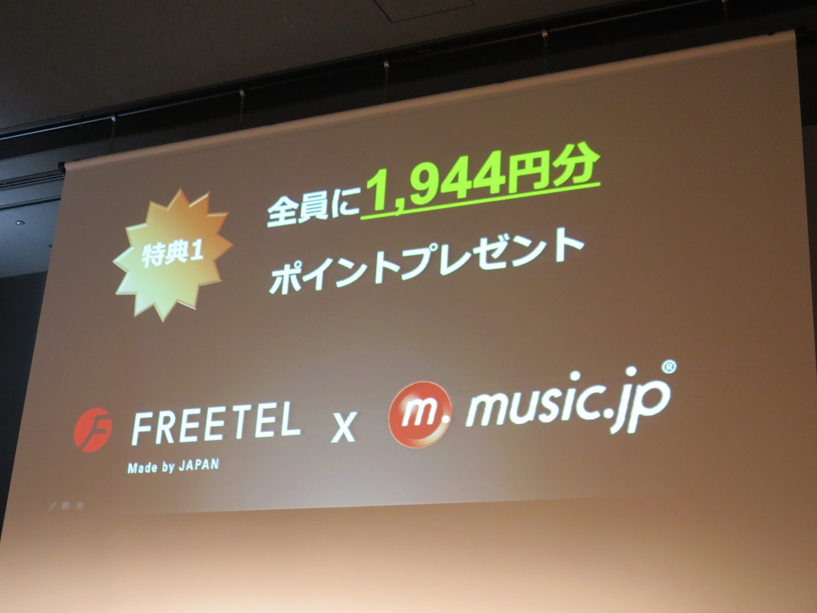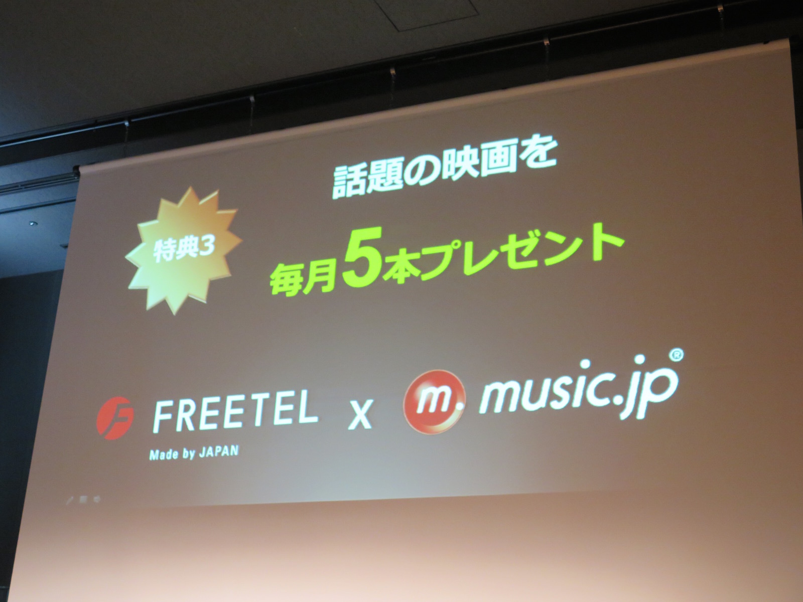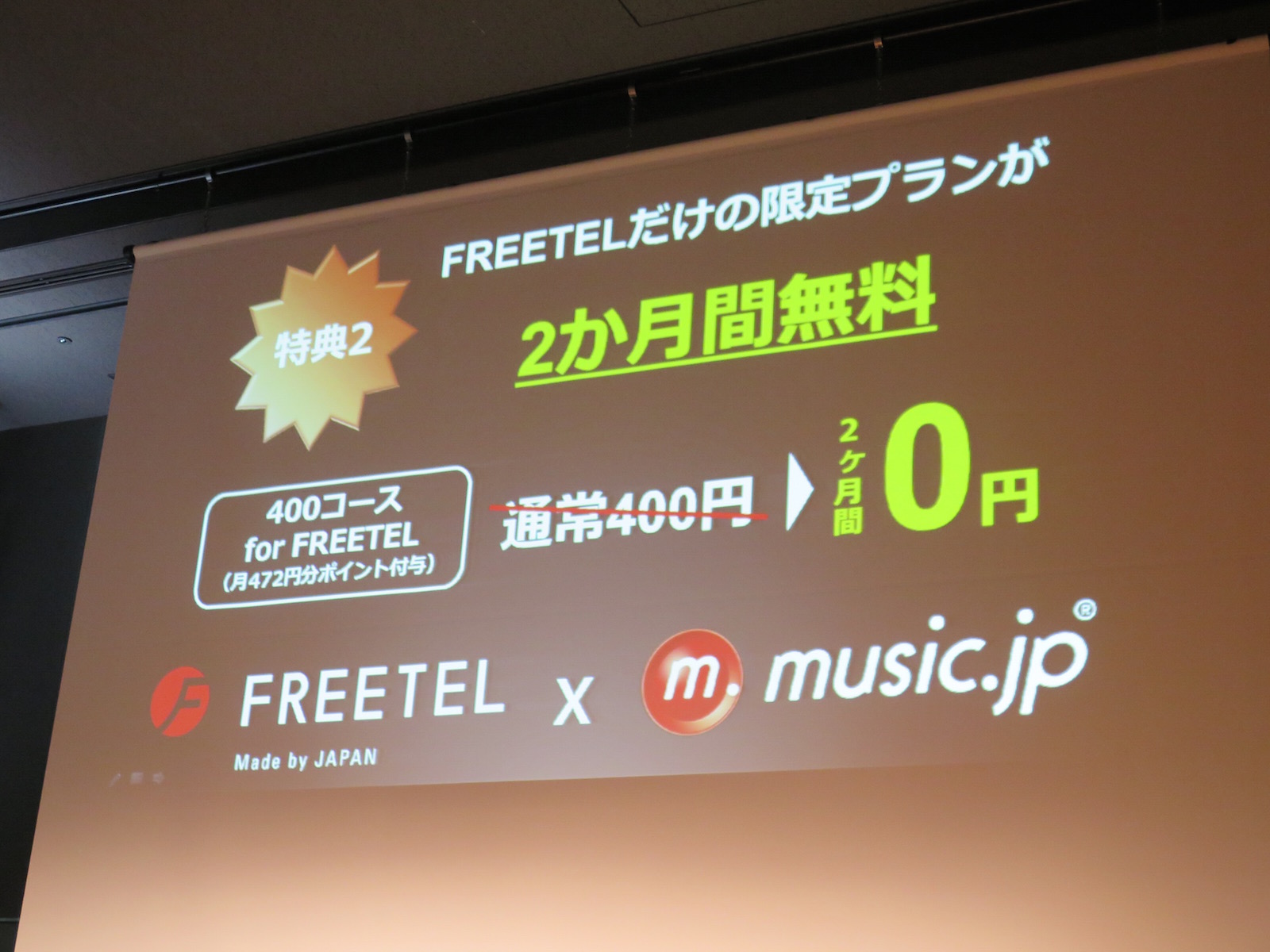 キャンペーン期間中にFREETEL SIMを購入し、月に472円相当のmusic.jpポイントが付与される「400コース for FREETEL」(月額400円/2カ月無料)に加入することが条件で、加入時に1944円相当のmusic.jpポイントが付与され、さらに、毎月話題の映画5本を無料で視聴できる特典も得られます。