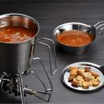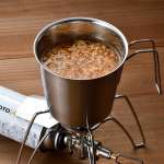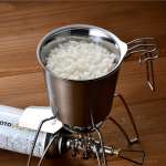 深形の「ステンレスシェラクッカー 800」は、使用時の適量は約500ml。調理兼食器に適しているのはもちろん、クッカーに水を入れ、お米と炊飯用の水を入れた「ステンレスシェラカップ 320」を乗せ、「ステンレスシェラスリッド」で蓋をすれば蒸気でふっくらと炊飯ができます。
