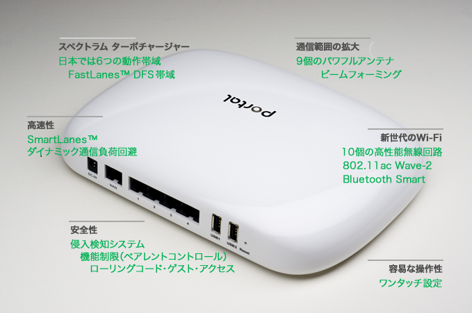 このようにデータ通信量が膨大になってきているWi-Fi環境のために設計されたのがターボチャージ Wi-Fiルータ「Portal」。独自のスペクトラムターボチャージャー技術により、元々は気象レーダー専用とされていた5GHz回線の特別に保護された部分を使ってWi-Fiが動作することを可能にしている。従来のWi-Fiルータと比較して5倍幅の回線へのアクセスを実現、Wi-Fi使用時のイライラを解消してくれる。
