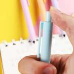 三角形のフォルムが特徴の「エターナルペンシル・ポップ」(638円)は、流行りの韓国系文具のようなカラーリングを採用。大きめの消しゴムとキャップが付属し、キャップはスマホスタンドとしても使えます。書き心地は硬めでやや薄く太めの筆跡となります。