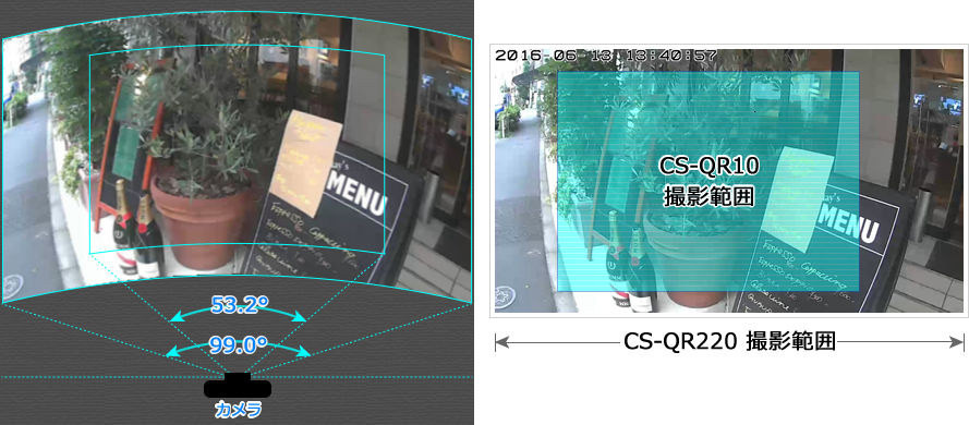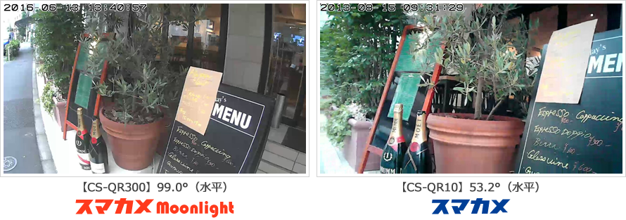 上の写真は、右が従来の「スマカメ」、左が今回新しく発売される「スマカメ ムーンライト」。左側の映像は、水平角度99度の広角レンズを使用しているため、以前のものより撮影できる範囲が広くなっているのがわかります。