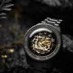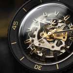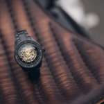 フルセラミックのベゼルに刻まれた数字とマーカー、ムーブメントの緻密な機構を背景に浮かび上がるインデックス、存在感のある時分秒針とRadoのロゴ、動く錨のマークなどのイエローゴールドカラーやマット仕上げの質感が、シックで落ち着いた雰囲気を演出。