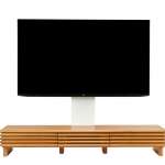 風格漂う仕上がりは単純に家具としても魅力的ですが、特筆すべきはボード背面中央に備えたスタンドネックです。この部分にテレビを直接取り付けることで、壁に穴を開けることなく壁掛け風のレイアウトを実現できる仕組み。ネック部分の素材をあえて本体と揃えず、壁色となじみやすいホワイトの化粧合板とすることで、まるで宙に浮いているかのような浮遊感が楽しめます。