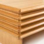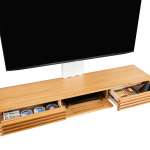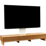 本体部分の製作は、高級家具の製作を中心に100年以上の歴史を持つ静岡の家具メーカー、起立木工が担当。サイズは幅2000×奥行き465mmで重さ58kg、天然ナラ材を井桁(いげた)調に重ねた外観は高級感たっぷりです。またボード中央のフラップ扉にはソフトダウンステー、左右の引き出しにはオートクローズを採用するなど、家具としての完成度にもこだわっています。