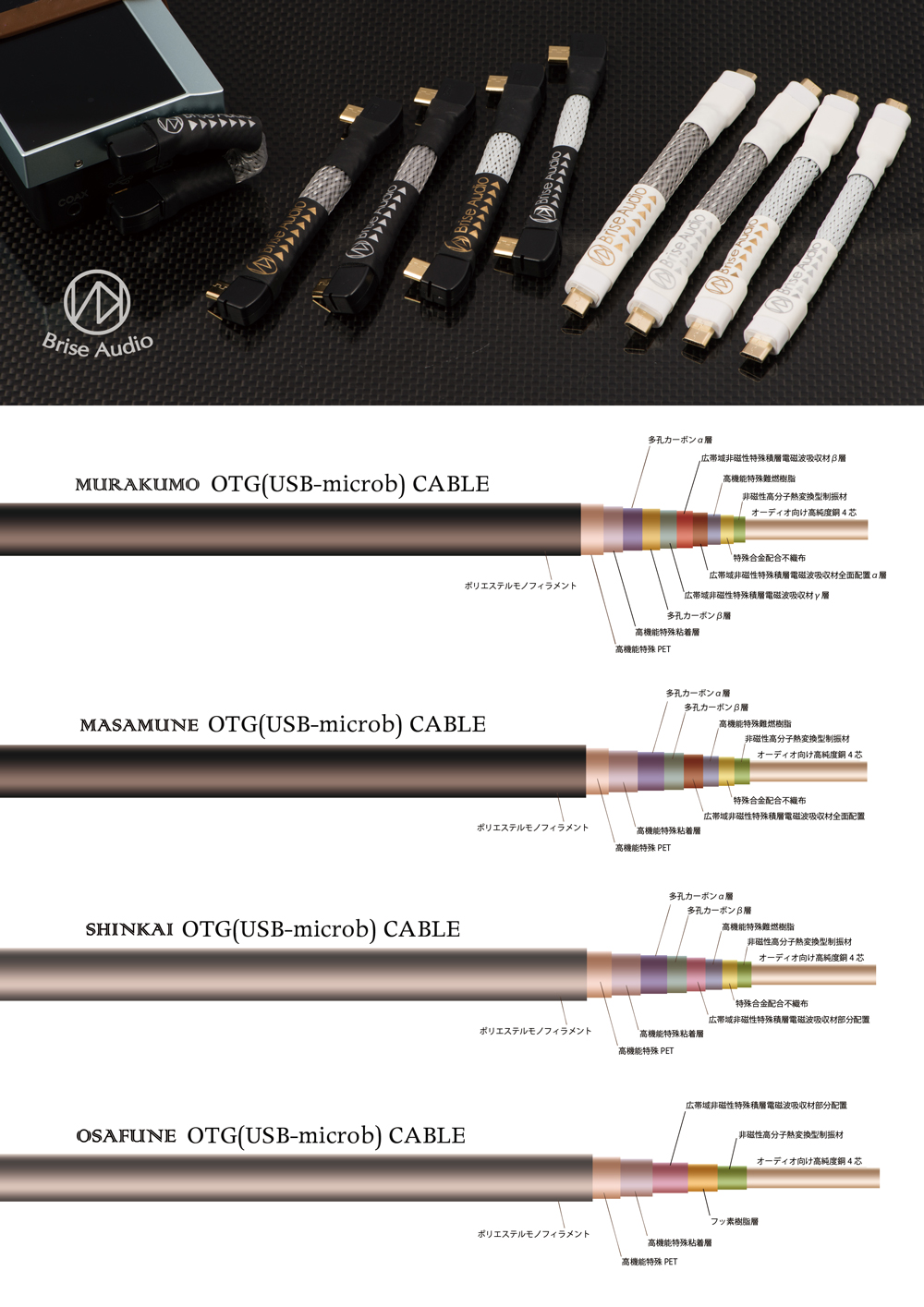 「BriseAudioハイエンドUSBホストケーブル」は、音質を最優先させ設計したUSB microB-microBケーブルだ。グレードごとに「OSAFUNE」「SHINKAI」「MASAMUNE」「MURAKUMO」の4種類を用意している。