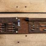 レザーケースは最高級グレインレザーを採用しており、補強ステッチを施した真鍮スタッド固定具が良いアクセントとなっています。予備の鉛筆芯を収納するための真鍮チューブが内蔵されており、芯が折れるリスクを軽減できます。メタルケースもレザーケースも携帯しやすいサイズです。