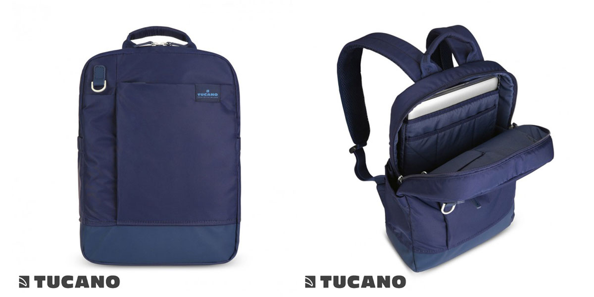 ▲「TUCANO AGIO リュック/バックパック」(1万5768円)カラー:ブルー、ブラック サイズ:27×39×11.5cm ポケットが多く多機能なリュック。背面上部にはキャリーバッグのハンドルを通せるキャリーサポーター付き。13インチのノートPCを収納可能。
