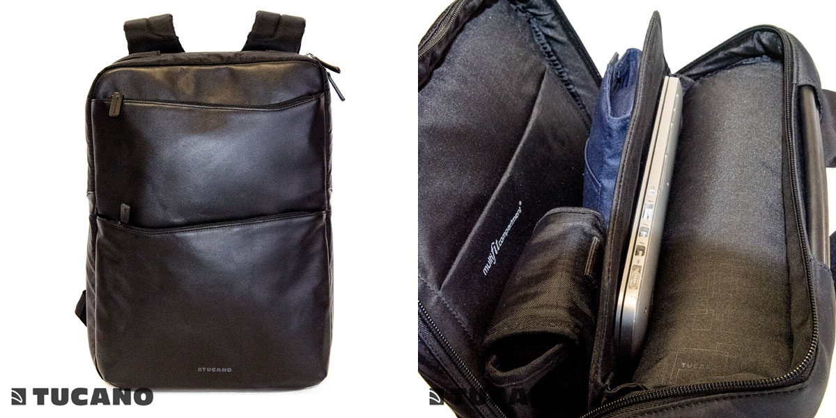 ▲「TUCANO FINA PREMIUM リュック/バックパック」(3万2400円)カラー:ブラック、レッド サイズ:30×41×10cm 本革素材のバックパック。15.6インチのノートPCを収納可能。
