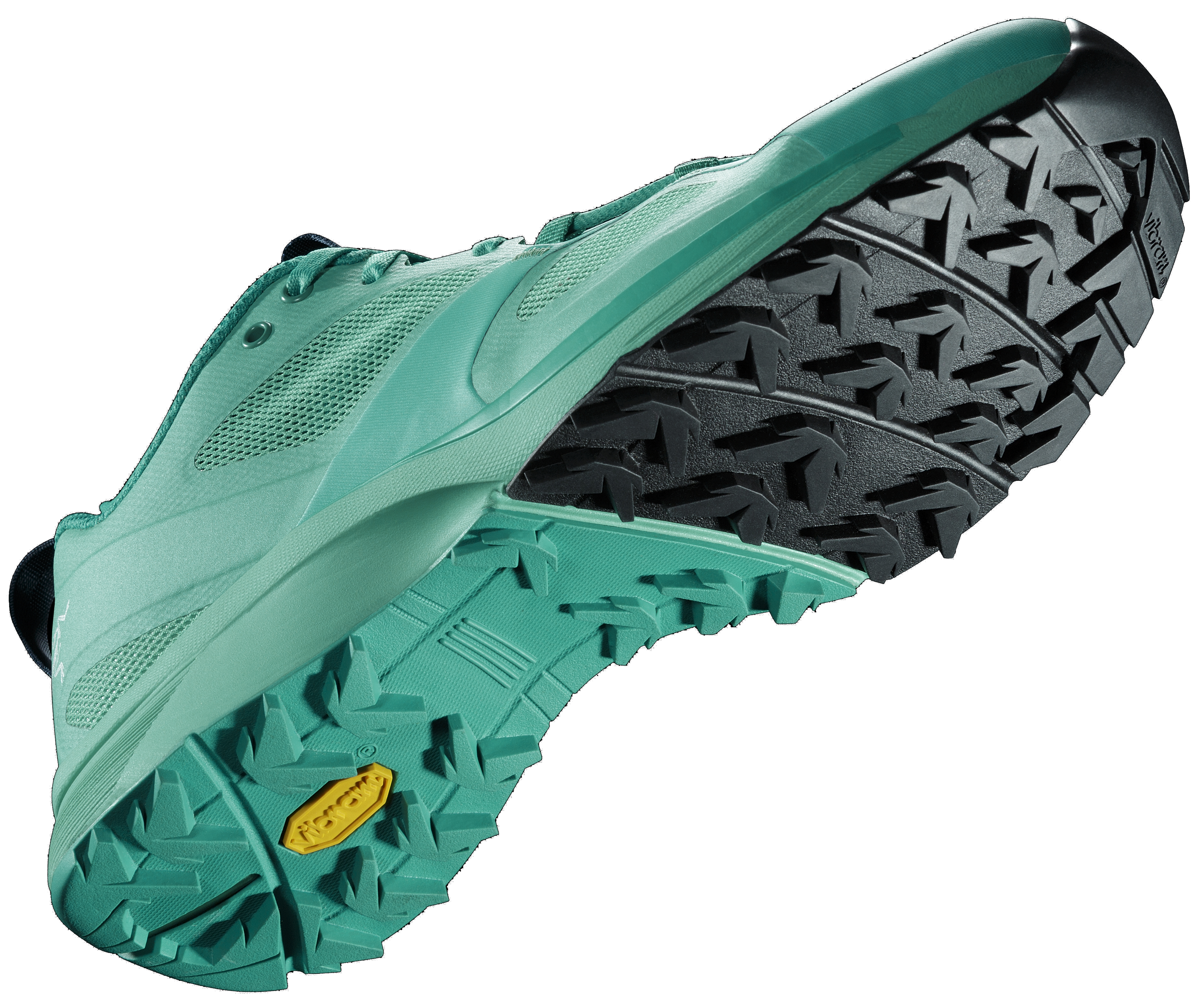 アウトソールには、登山用のソールを専門とするVibram社と開発した2種のオリジナルソールを採用。中央からヒールにかけては、濡れた路面でも滑りにくく、柔軟性と耐久性を維持する「Vibram Megagrip」を、前足部にはクランブリングや岩場の過酷な環境で粘着力を発揮する「Vibram Idrogrip」を採用しており、山形紋3.5mm高のトレッドがあらゆる方向から地面をとらえてトラクション性能をアップさせます。