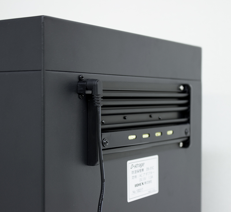 気密性の高いキャビネットがホコリをシャットアウト。その上、半導体素子(ペルチェ素子)を用いた専用の除湿ユニットによって素早く除湿し、カビから守ります。定期的に乾燥剤を再生する時間が必要な乾燥式とは異なり、常に除湿を続けることができますし、湿度25~50%の範囲を1%単位で設定できます。