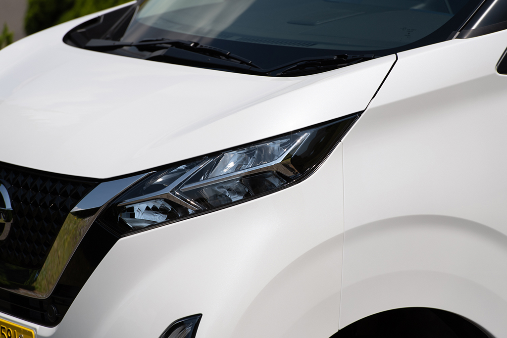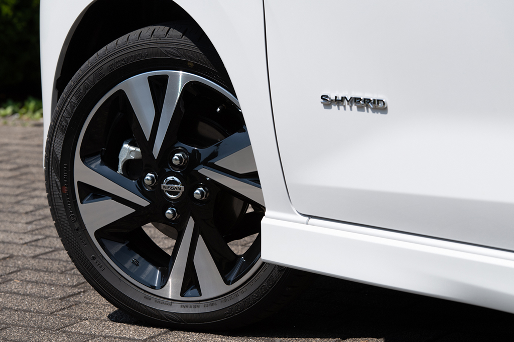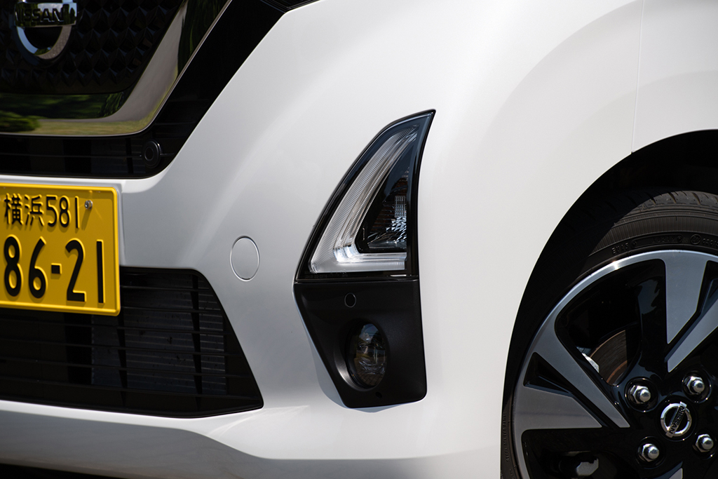 確かにサイドから見ると、ウインドウの形状や、リアへと伸びるブラックの加飾によって屋根が浮いたように見えるフローティングルーフ、そして、立体的なプレスラインが目を引くドアやボンネットを始めとするボディパネルなどが、ekシリーズと共通であることに気づきます。一方、デイズ ハイウェイスターのフロント部には、最近の日産車におけるアイコンともいうべきVモーショングリルが備わり、なんともりりしく迫力ある顔つきとなっています。