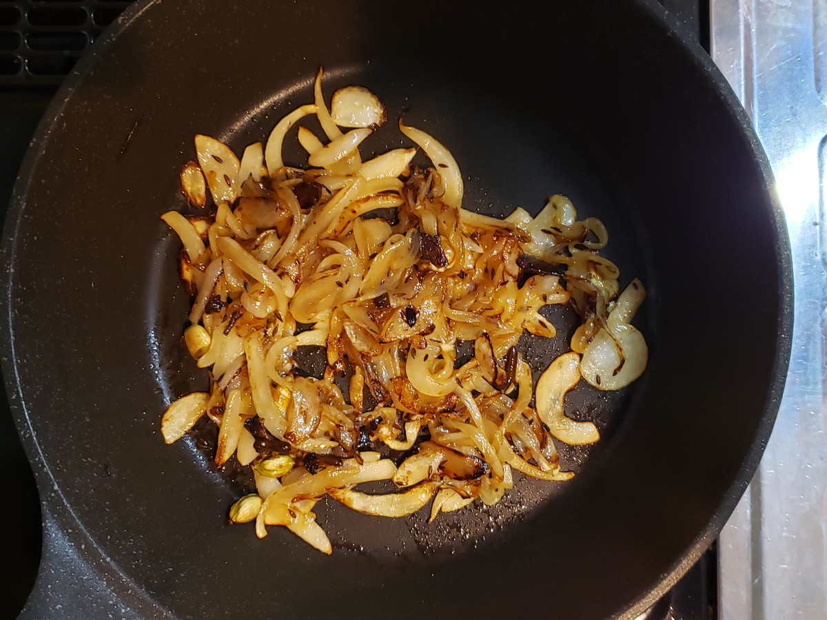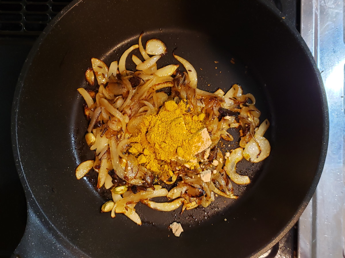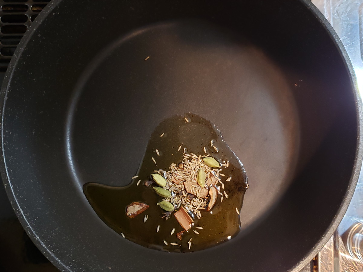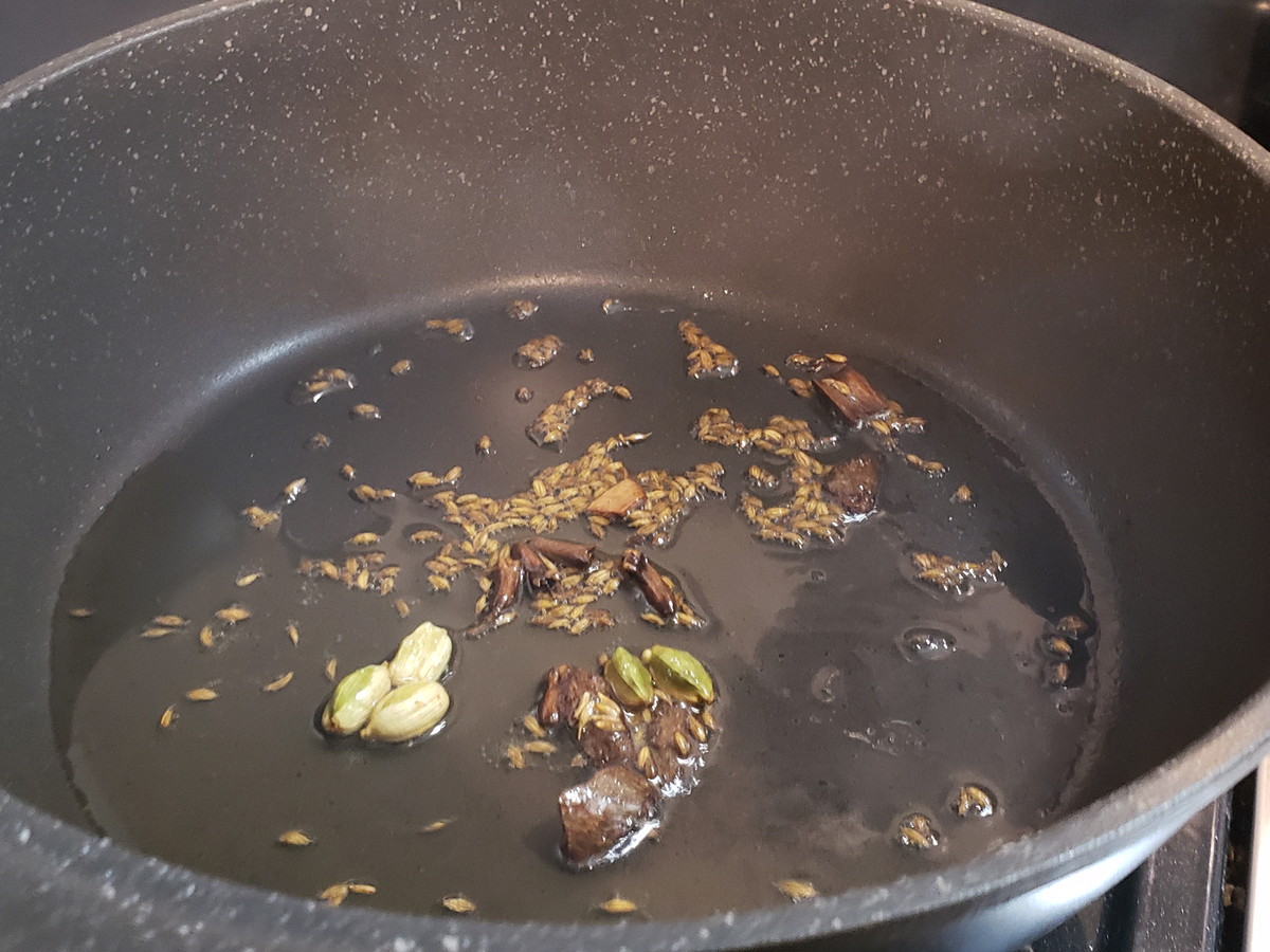 ごはんをお皿によそって、カレーをかける。ちらほら見える挽いていない1段目のホールスパイスが気になりますが、いいんです。でも、最近流行りのスパイスカレーにより近づけたいということで、用意したのがこれ。