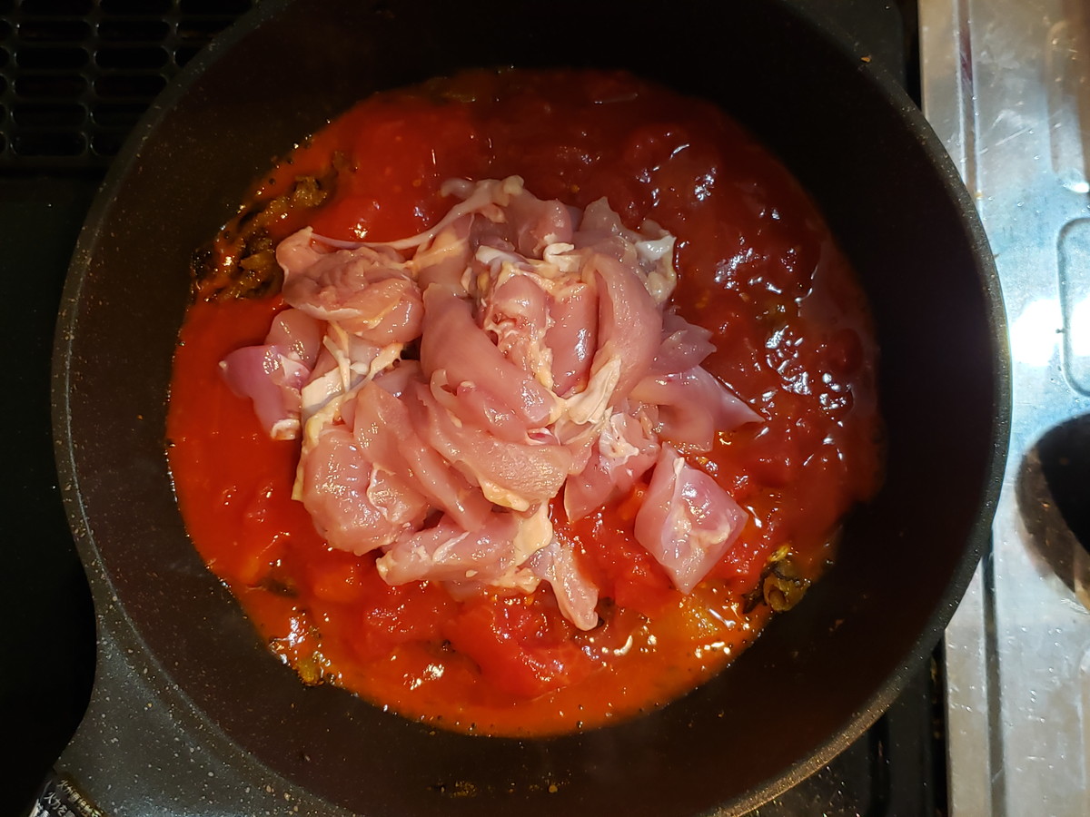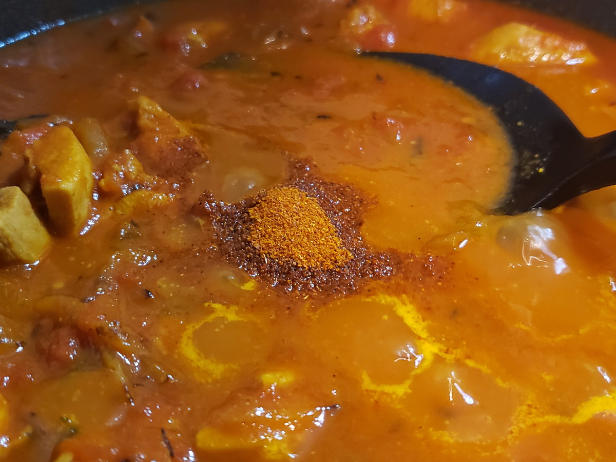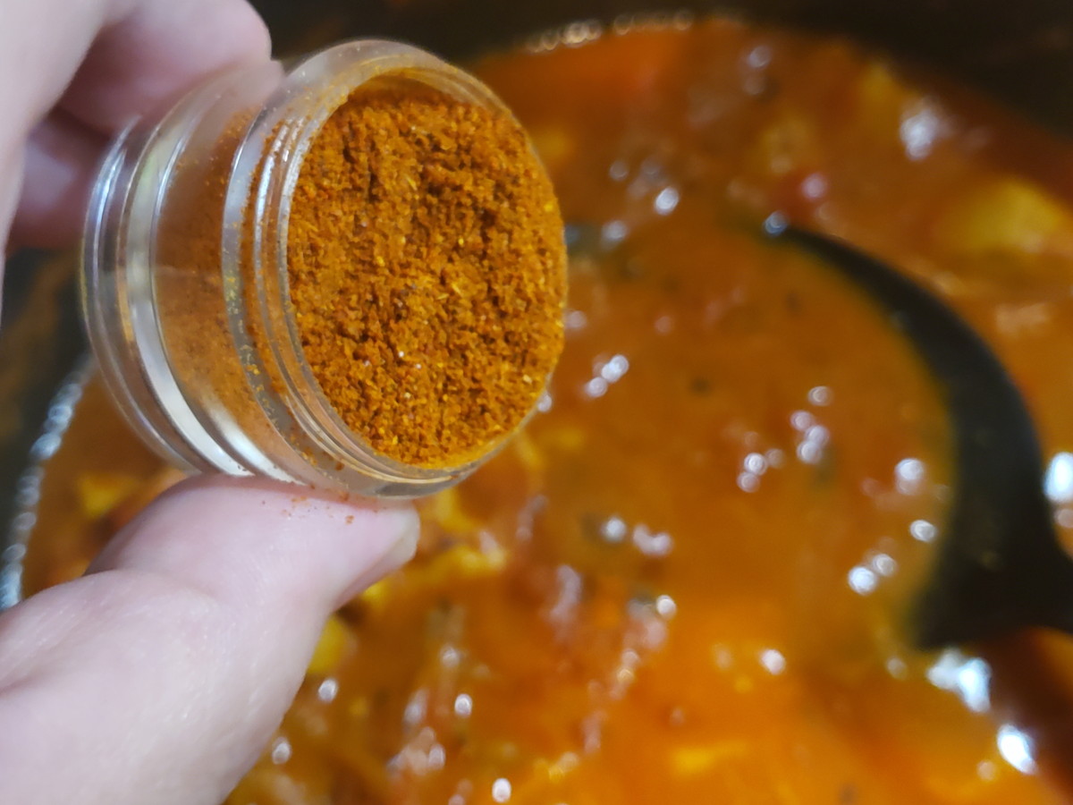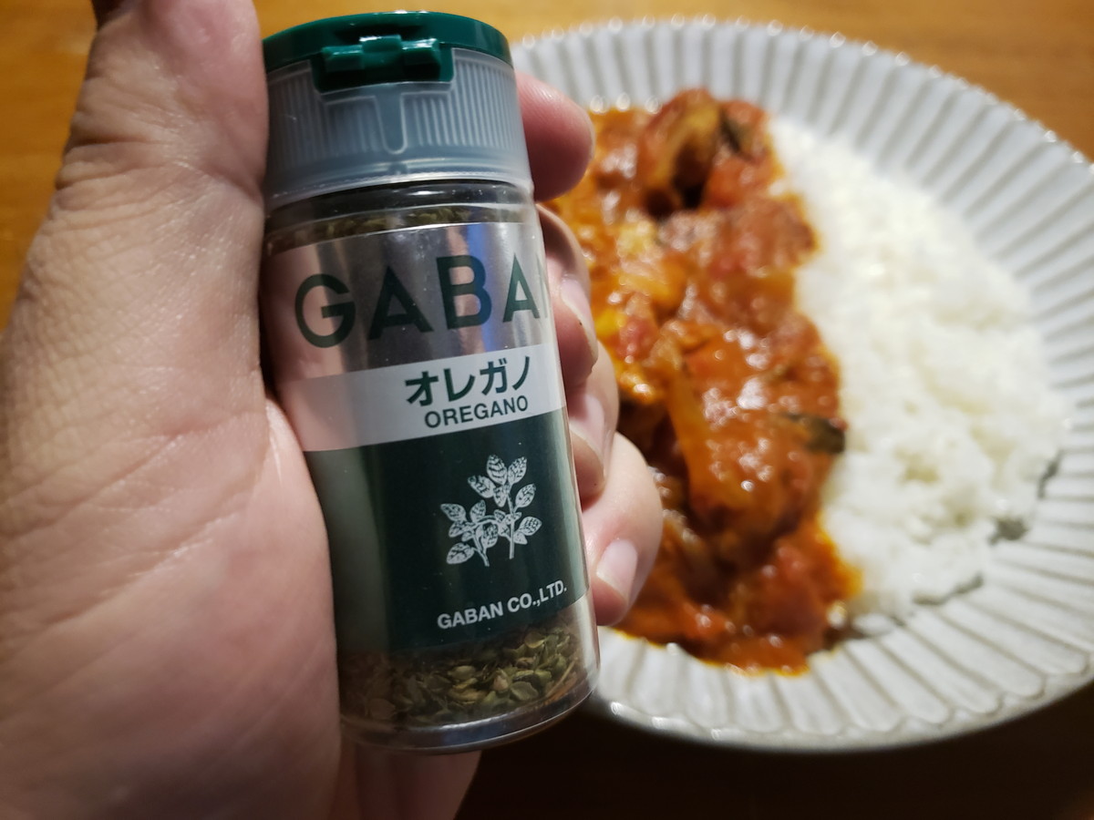 オレガノ! トマトに合う乾燥ハーブです。人気スパイスカレー店では、カレーの上にパラパラッとハーブっぽいモノをまぶしているところが多く、たぶんオレガノまぶせばそれっぽくなるんじゃね? と思い買っておいたものです。これをパパッとまぶすと…