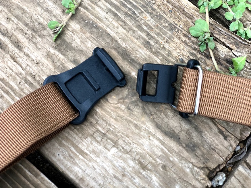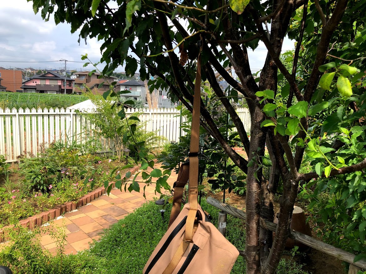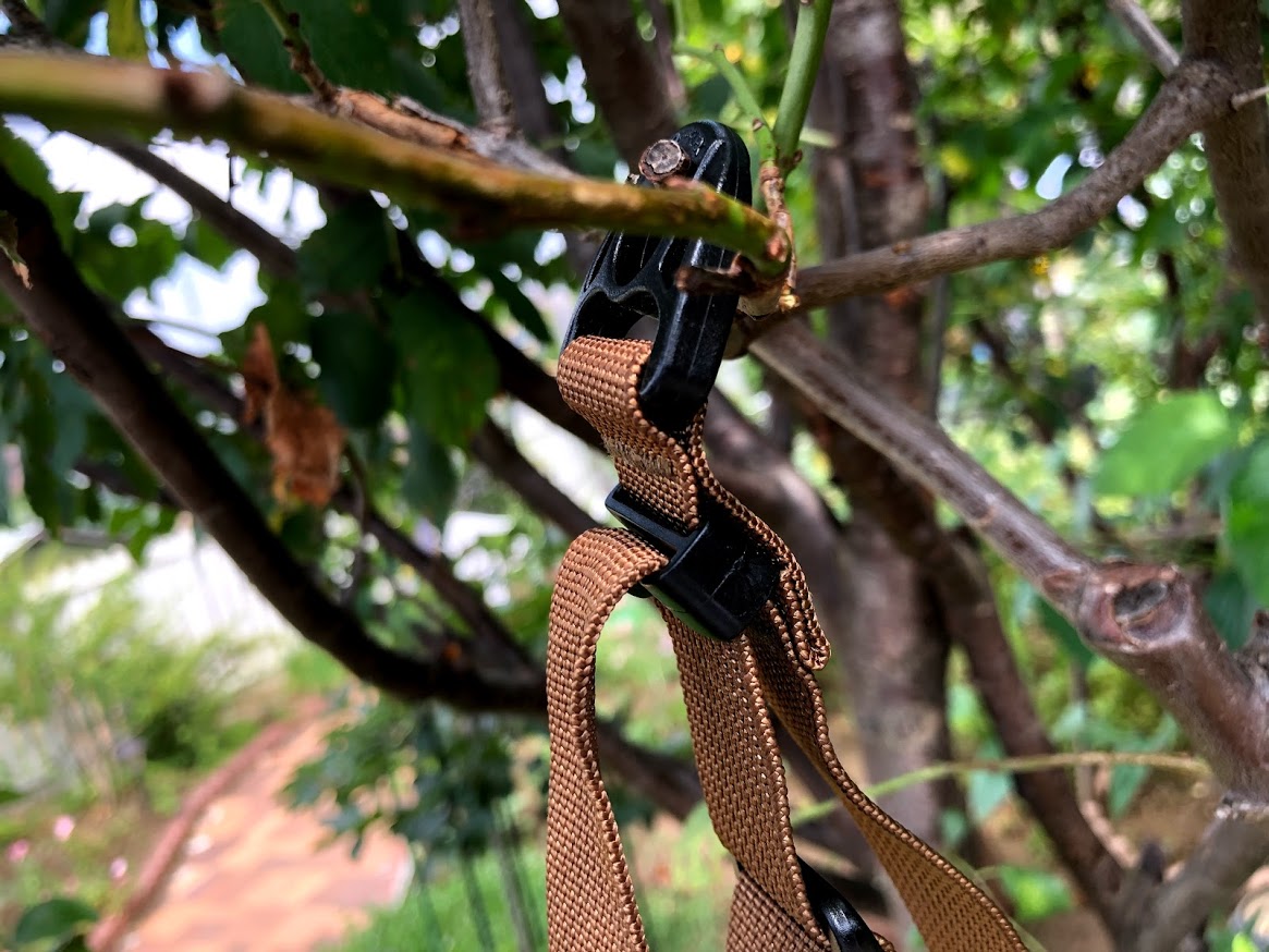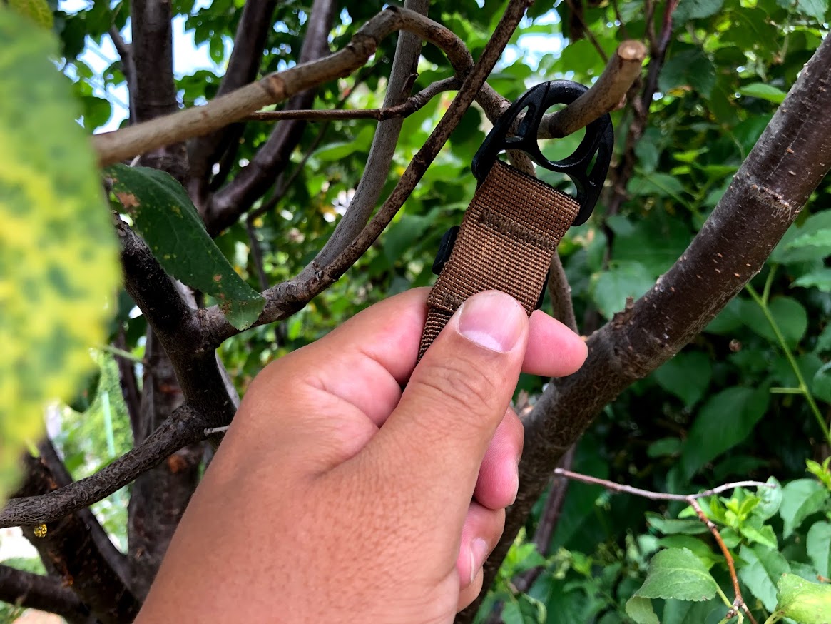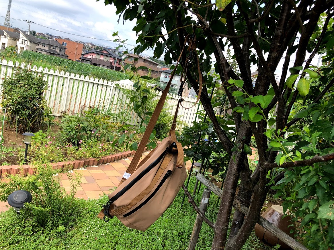 さらにショルダーストラップの片方から伸びる先には、丸い穴の空いたホルダーが。最初は単なるデザインかと思いましたが、キャンプに行った先で「これ、木に引っ掛けられるじゃん」と気が付き、さっそく実行したところ、ぶら下げられる仕様に変身。