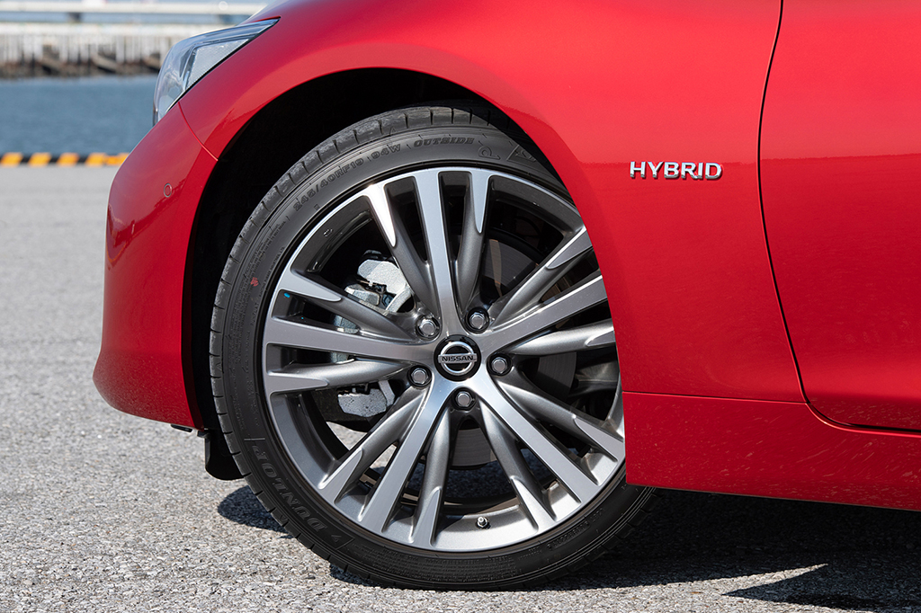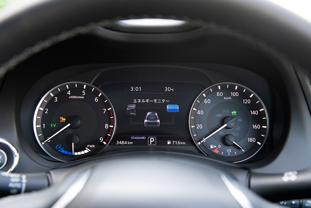 パワーユニットは、最高出力306馬力を発生する排気量3498ccのV型6気筒DOHC“VQ35HR”型ユニットに、最高出力68馬力の“HM34”型モーターを組み合わせ、システム最高出力は364馬力を発生します。モーターは7速ATとの一体になっていて、前後にふたつ備わるクラッチが、走行状態によってモーターとエンジンとを適宜、断続する仕組みとなっています。
