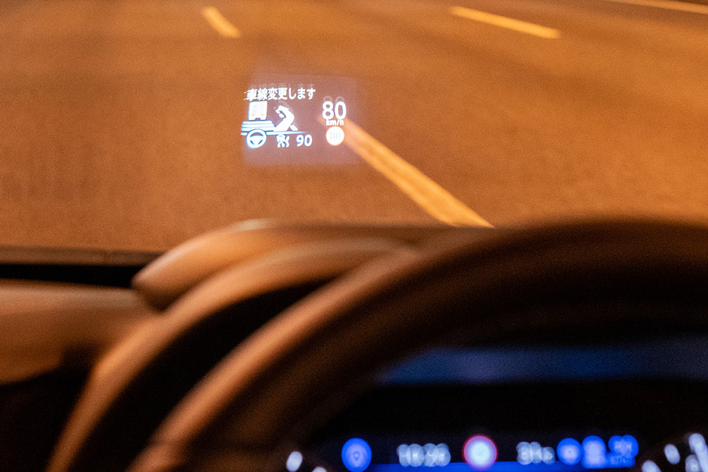 ここからハンズオフドライブへ移るに当たって、ドライバーが何か特別な操作を行う必要はありません。メーター(とヘッドアップディスプレイ)に表示されるアイコンがグリーンであれば、ステアリング操作や追従走行を含んだ一般的な運転支援をクルマ側が行い、アイコンの色がブルーに変われば、同一車線内でのハンズオフドライブが可能な状態となります。
