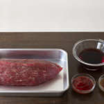 材料は、牛モモブロック(450g)、塩小さじ2/3、黒コショウ小さじ1/2。ソースが赤ワイン1/4カップ、トマトケチャップ大さじ2、ウスターソース大さじ1。