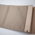 ▲一時収納するマスクは、端のレザー部分にある切り込みに紐を引っ掛けて固定