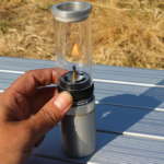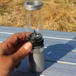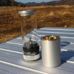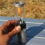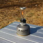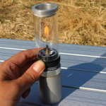 「ルミエールランタン」φ7.3×6×H18.3cm、210g、「リトルランプ ノクターン」φ4.2×4×H10.5cm、102gなので、ライバルと比べると最もスリム。高さは15.6cmというものの、下部はガスを充填するタンクなのでライバルのようにOD缶を装着する上の部分だけなら高さ11cm。「リトルランプ ノクターン」よりやや背が高いだけなので、ずいぶん小さい印象です。