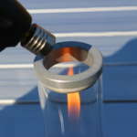 ガスの充填方法は、タンクをテーブルに置いて燃料缶を上からまっすぐ差し込むだけ。満タン(約8秒)になったら脇からガスが吹き出します。これが満タンの合図なのですが、最初はちょっとびっくりするかも。