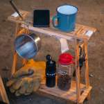 天板のスリットにはシェラカップを。さらに斜めに刺して火吹き棒置き場としても使いました。柱となる板にはカラビナを引っ掛け、そこに箸ケースをぶら下げています。下段にはコーヒー道具とグローブを、上段はマグカップとスマホ置き場として使いました。