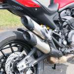 マフラーは跳ね上がったような形状の2本出し。有機的な曲線を描くエキパイがよく見えるのもネイキッドマシンの「モンスター」ならではの美点です。