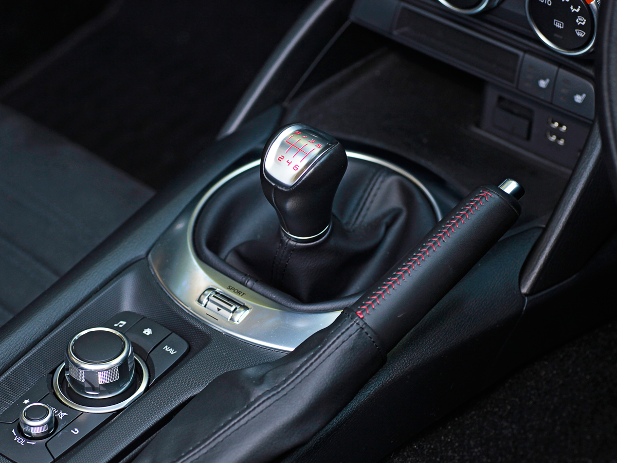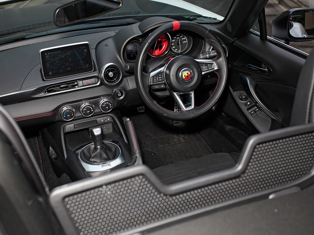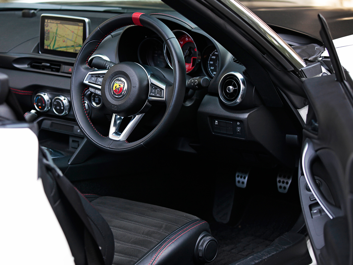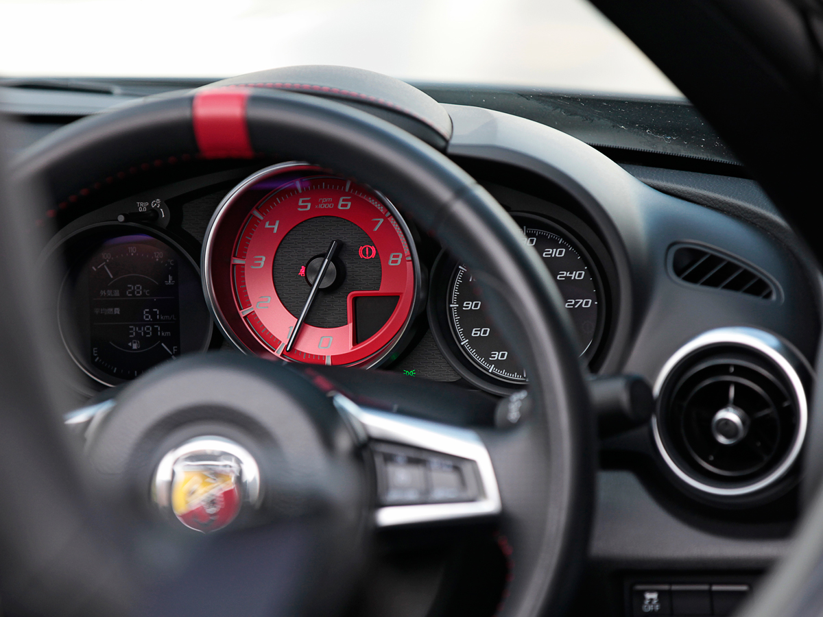 試乗したのはMT仕様。ドライバーズシートに座ると、アルカンタラをおごった独自形状のシートや、太い取っ手が付いたドアの内張り、そして、四角いシフトノブが、ひと目で分かる“ロードスターとの違い”。さらに、タコメーターは赤くなり、ステアリングホイールの中心でも、サソリが毒尾を振り上げています! アバルト 124スパイダーは、外観に違わず、内装も頑張って差別化しています。