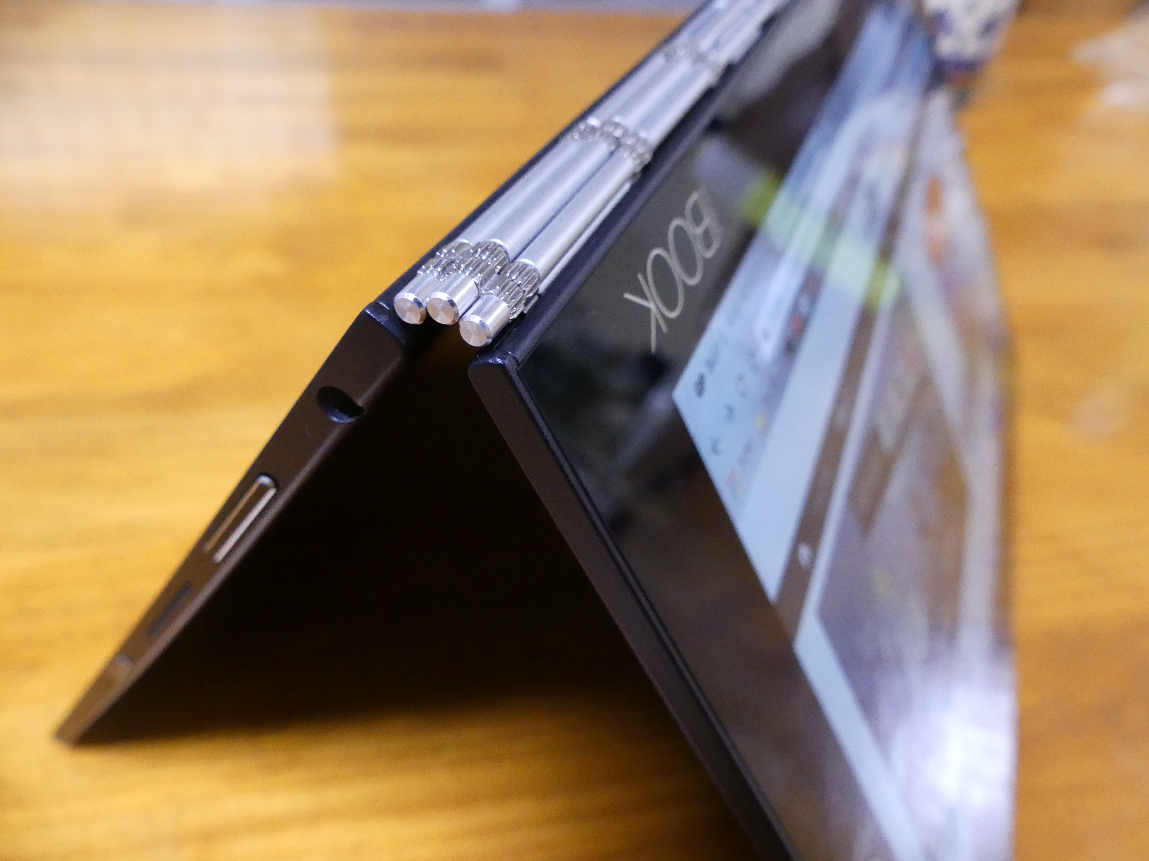 まず大きな特徴として挙げられるのは、同社得意の360°可動できるヒンジを利用した4つの形態。もはやノートパソコンと呼ぶには広すぎる汎用性を持ち、ロボットの変形に似た感動すら覚える。それぞれの機能性より、「使ってみたくなる」形状そのものがヨガブック最大のポイントだと感じた。